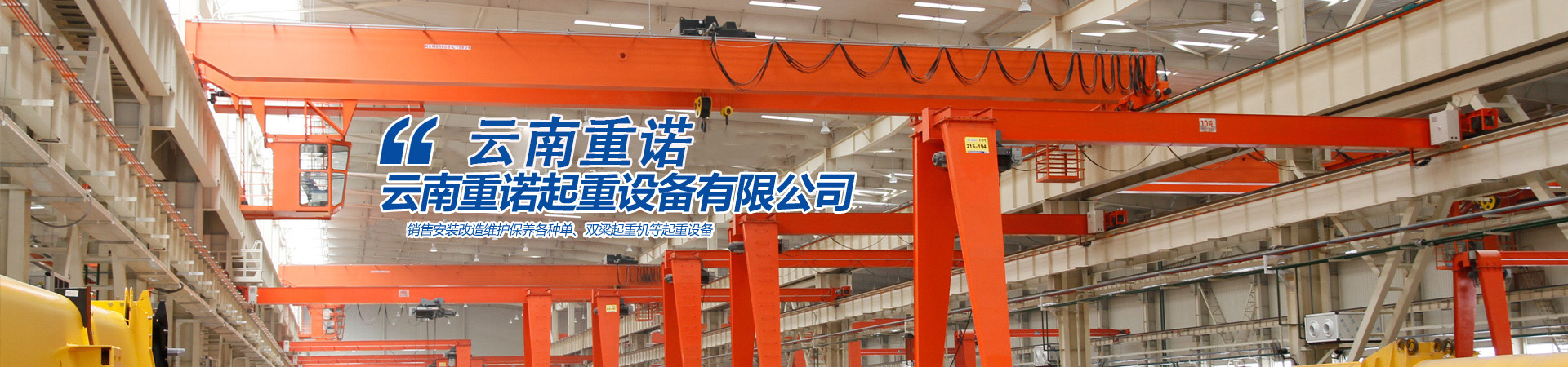 云南重諾起重設備有限公司主要經營銷售:橋式起重機、門式起重機、懸掛起重機、旋臂起重機、電動葫蘆、升降貨梯、電動平車、液壓升降平臺、升降搬運設備、起重配套工具、起重軸承、起重機各部位配件。公司產品暢銷全國各地,深受用戶的信賴。  公司通過了ISO9001 :2000質量體系認證具備320T及以下噸位橋式起重機、280T及以下噸位門式起重機特種設備制造許可證.320T及以下起重機的特種設備安裝......更多>>